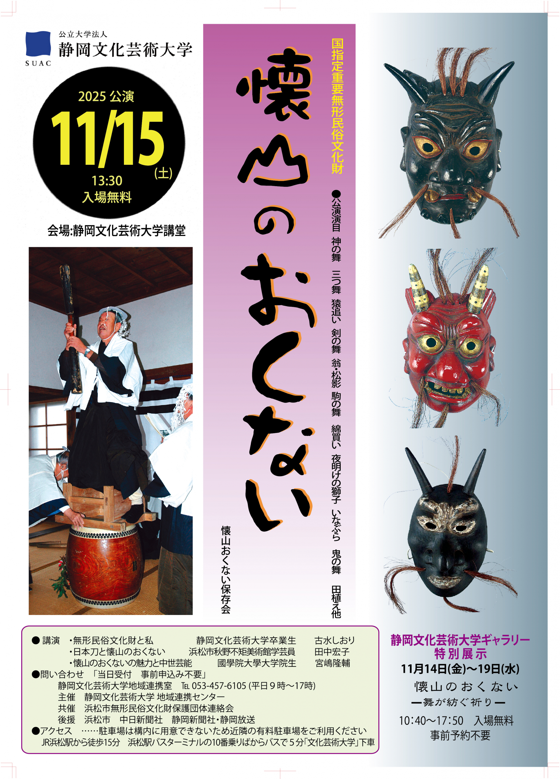 静岡文化芸術大学では、北遠地域に伝来した祭祀芸能の魅力を広く発信することを目的に特別展示「懐山のおくない~舞が紡ぐ祈り~」を開催します。