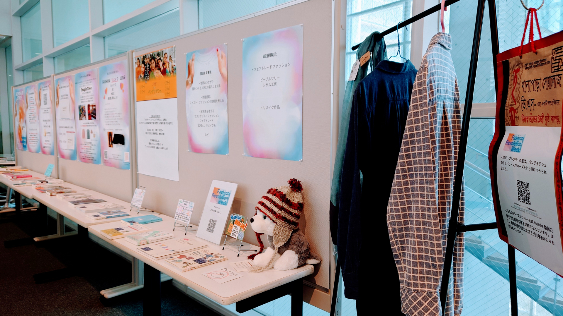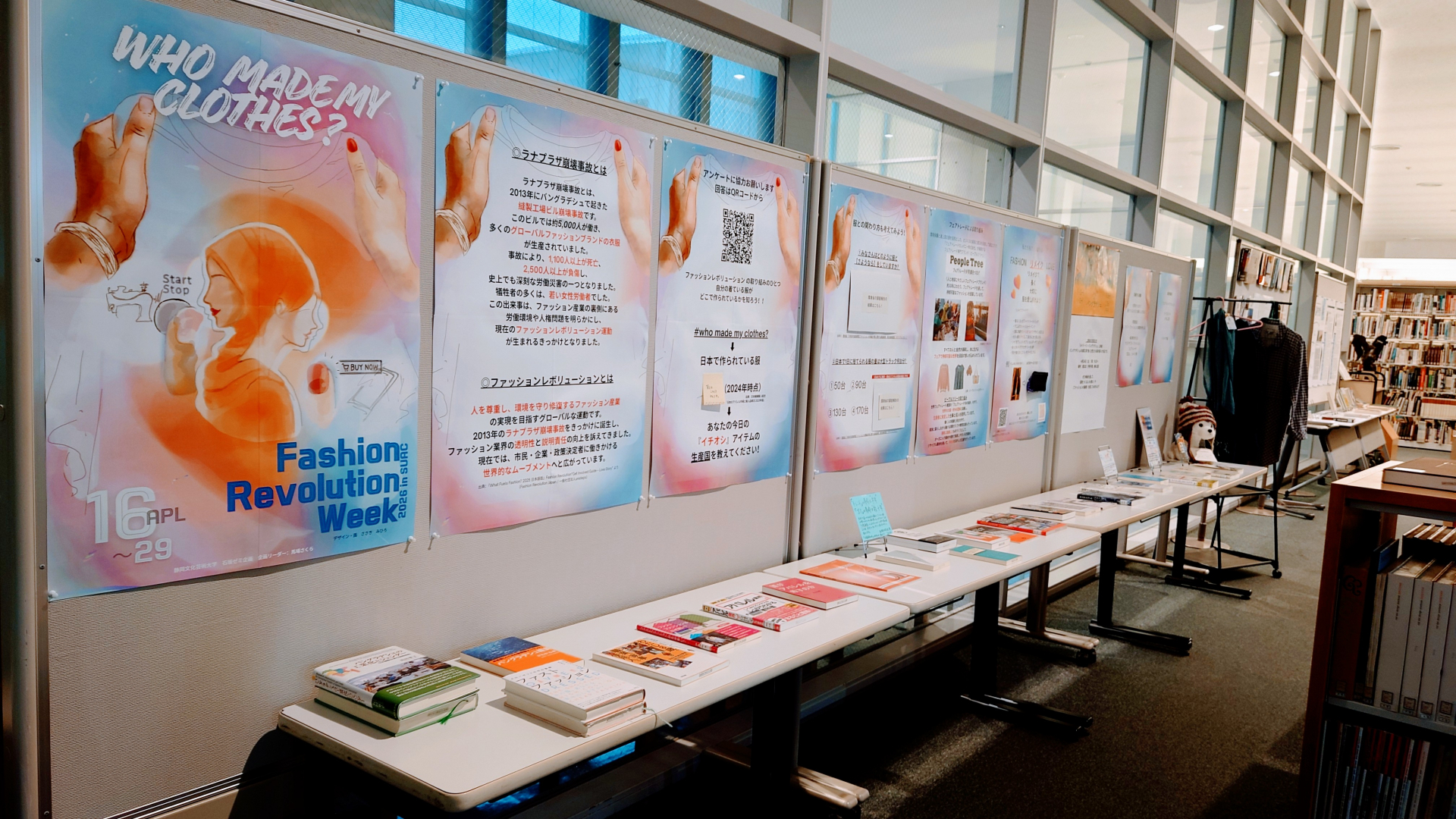 当館で、学生が制作したポスターやポップ、関連資料、実践例の作品・商品などから、ファッションレボリューションについて紹介する展示を行っています。ぜひご覧ください。