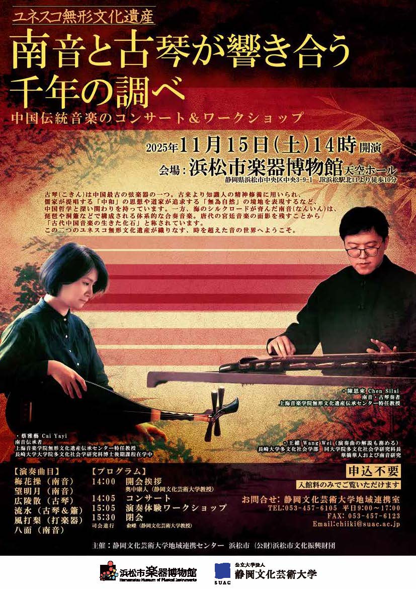 静岡文化芸術大学では、南音と古琴が紡ぐ中国古典音楽の魅力の発信をテーマとするイベント「南音と古琴が響き合う千年の調べ 中国伝統音楽のコンサート&ワークショップ」を開催します。
