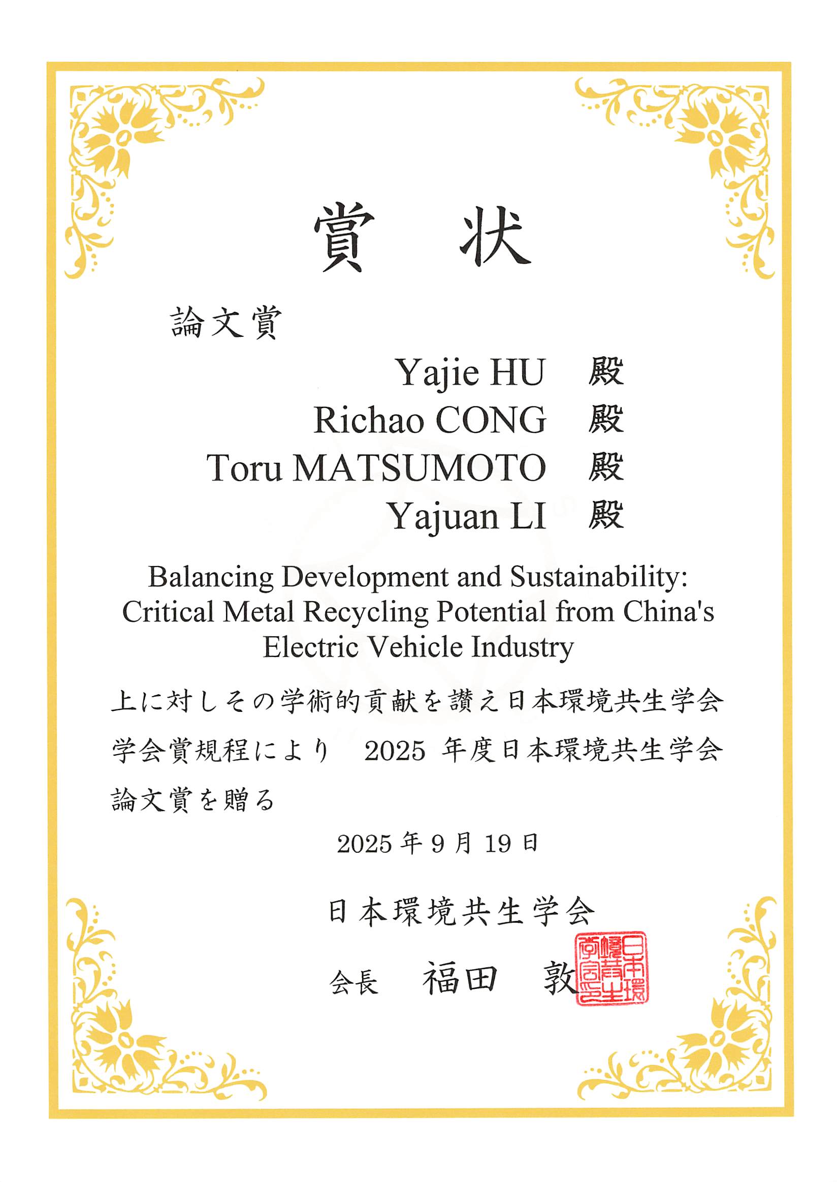 論文賞は、日本環境共生学会誌に掲載された原著論文の中から、特に優れたものとして選ばれるものであり、また奨励賞は、研究に関する将来性を十分有すると判断できる40歳未満の者を表彰する賞になります。叢講師が受賞した2つの賞のうち、論文賞は、叢講師が第2著者として執筆した論文が評価されました。