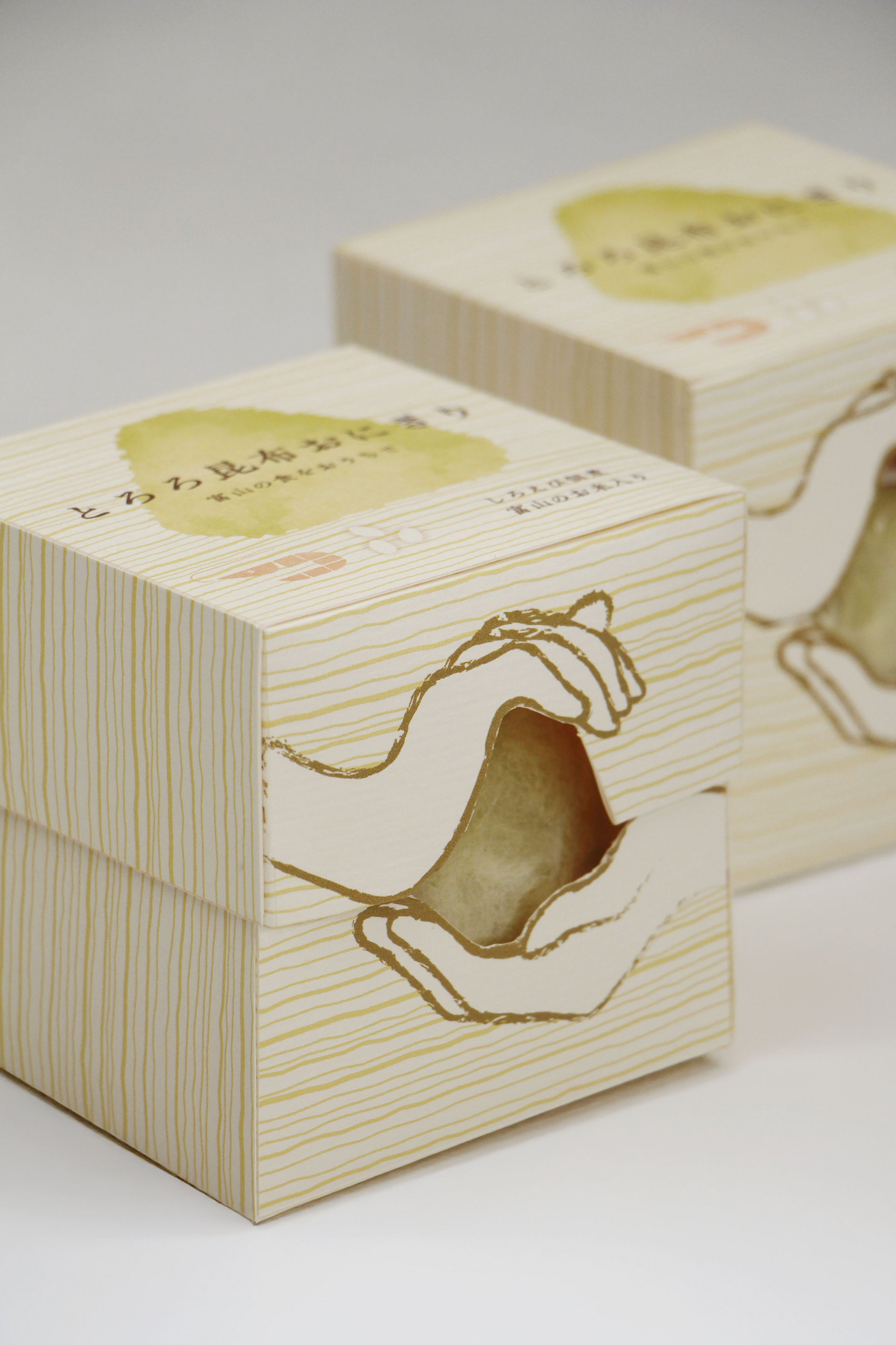 富山では昆布文化が深く根付いており、中でもとろろ昆布おにぎりは家庭の味として親しまれています。本パッケージは、その魅力を自宅で「自分の手で握る体験」とともに味わえるお土産です。おにぎりを握る様子を再現し、おにぎり型の箱にはとろろ昆布・白エビの佃煮・富山米をセット。さらに北前船の寄港によって広がった昆布文化の歴史も紹介しています。ふわふわのおにぎりを握りながら富山の食文化に触れることができるデザインとしました。